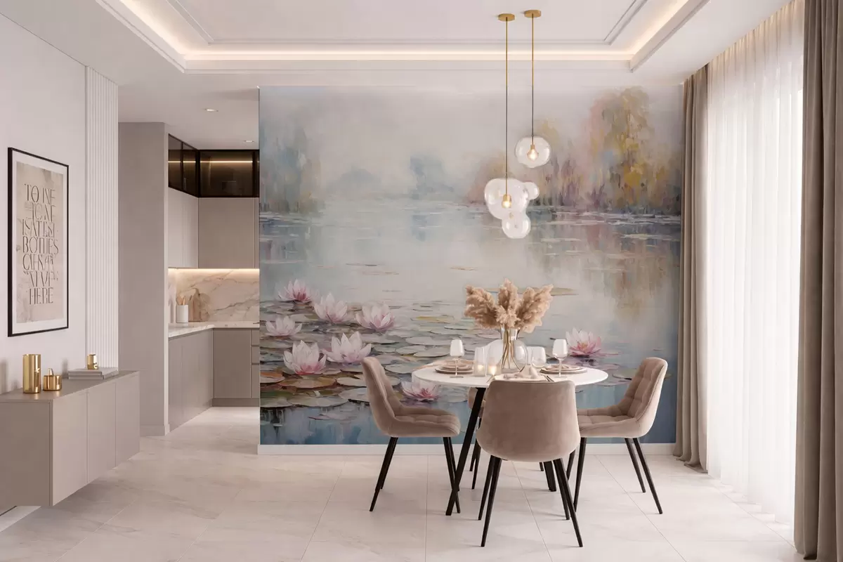 Valokuvatapetti Impressionistinen järvi, jossa on vesililjoja ja pehmeää valoa Nr w05515