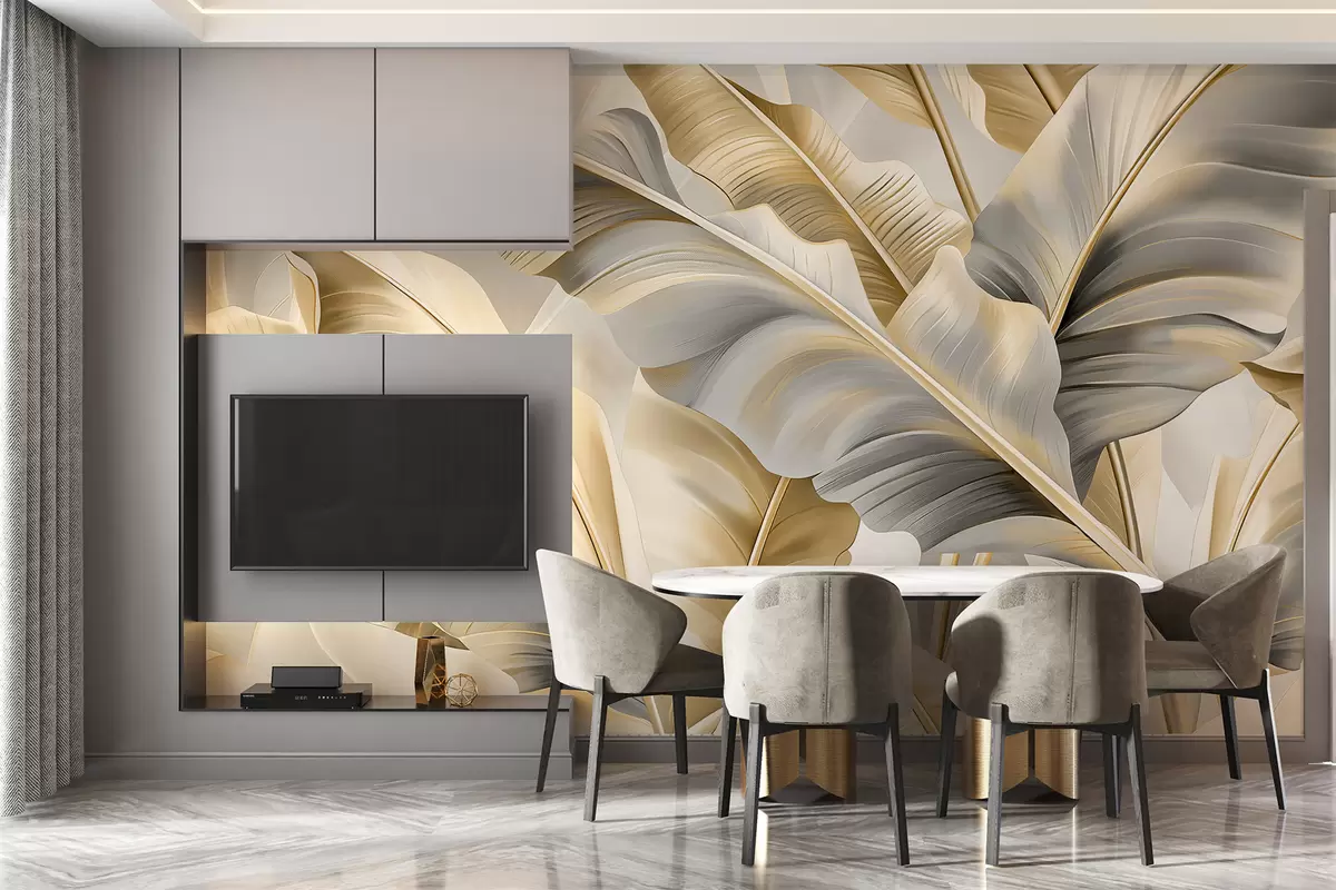Valokuvatapetti ylelliset suuret banaaninlehdet harmaan beigen sävyissä Nr w07876