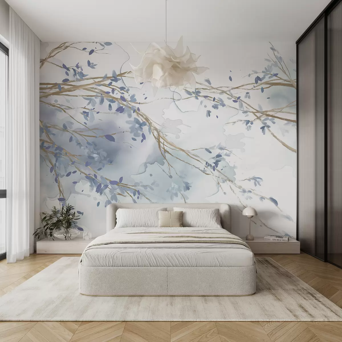 Valokuvatapetti Herkät sinivalkoiset kukkaoksat pehmeällä, sumealla akvarellitaustalla Nr w07919