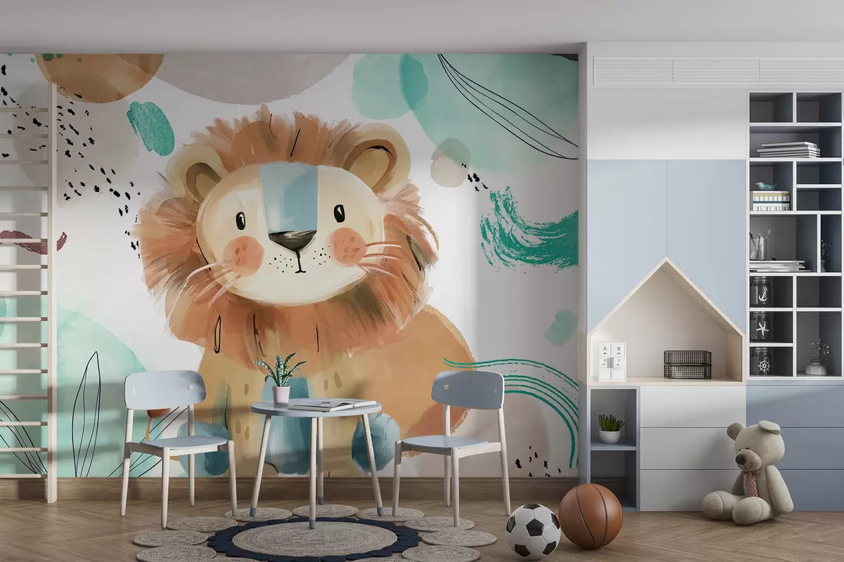 Valokuvatapetti Söpö sarjakuvaleijona värikkäällä, abstraktilla taustalla siveltimen vedoilla ja pastellivärien roiskeilla Nr w07924