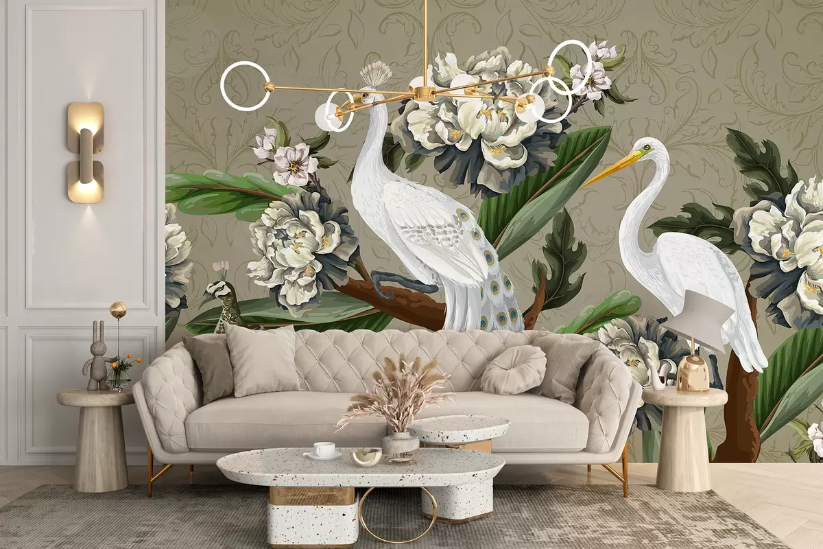 Valokuvatapetti Pari valkoista riikinkukkoja, joilla on pitkä häntä Nr w07975