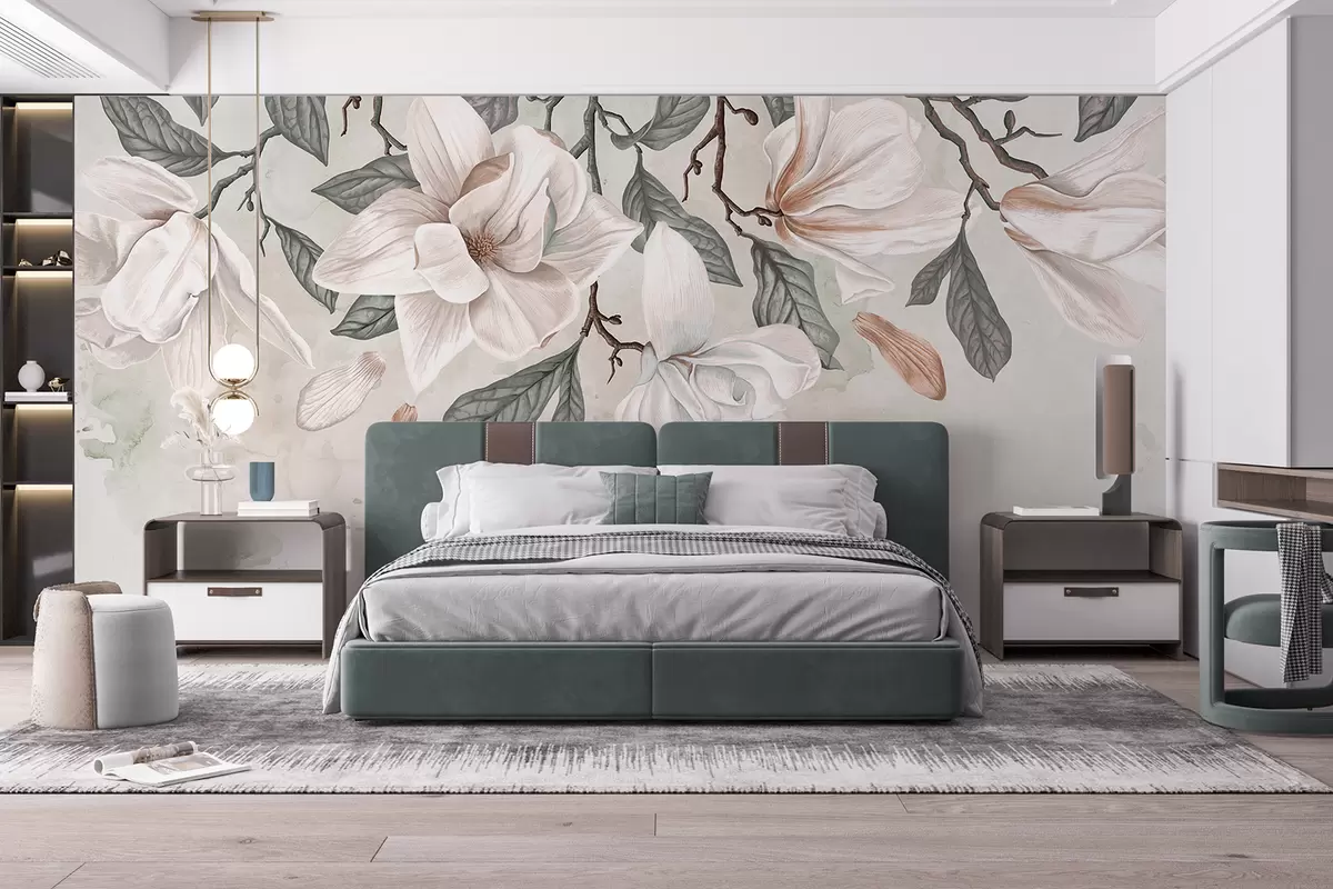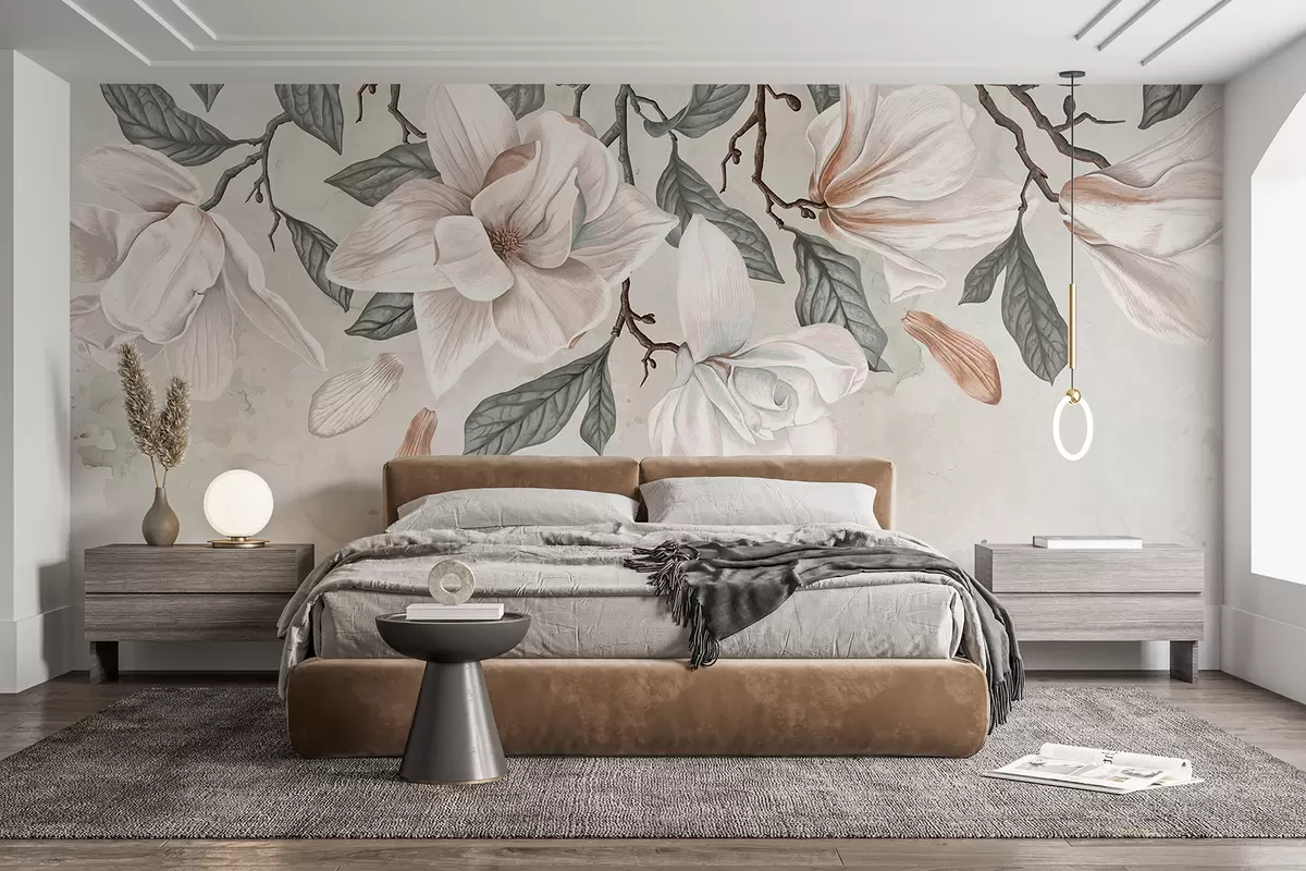 Valokuvatapetti Herkät vaaleanpunaiset ja valkoiset magnolian kukat vihreillä lehdillä vaalealla taustalla, pehmeä, kukkainen koostumus Nr w07977