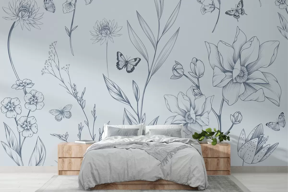Valokuvatapetti Boho yksiväriset kukat ja perhoset sinisenä Nr w08088v2