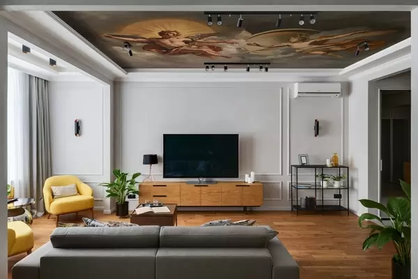 Valokuvatapetti seinämaalaus renessanssin freskojen tyyliin beigen ja tummissa sävyissä. Kaksi jumalan mieshahmoa ojentamassa toisiaan. Nr w08137