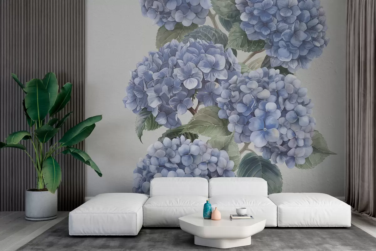 Valokuvatapetti Hortensian oksat pehmeän sinisen sävyin Nr w08176v2