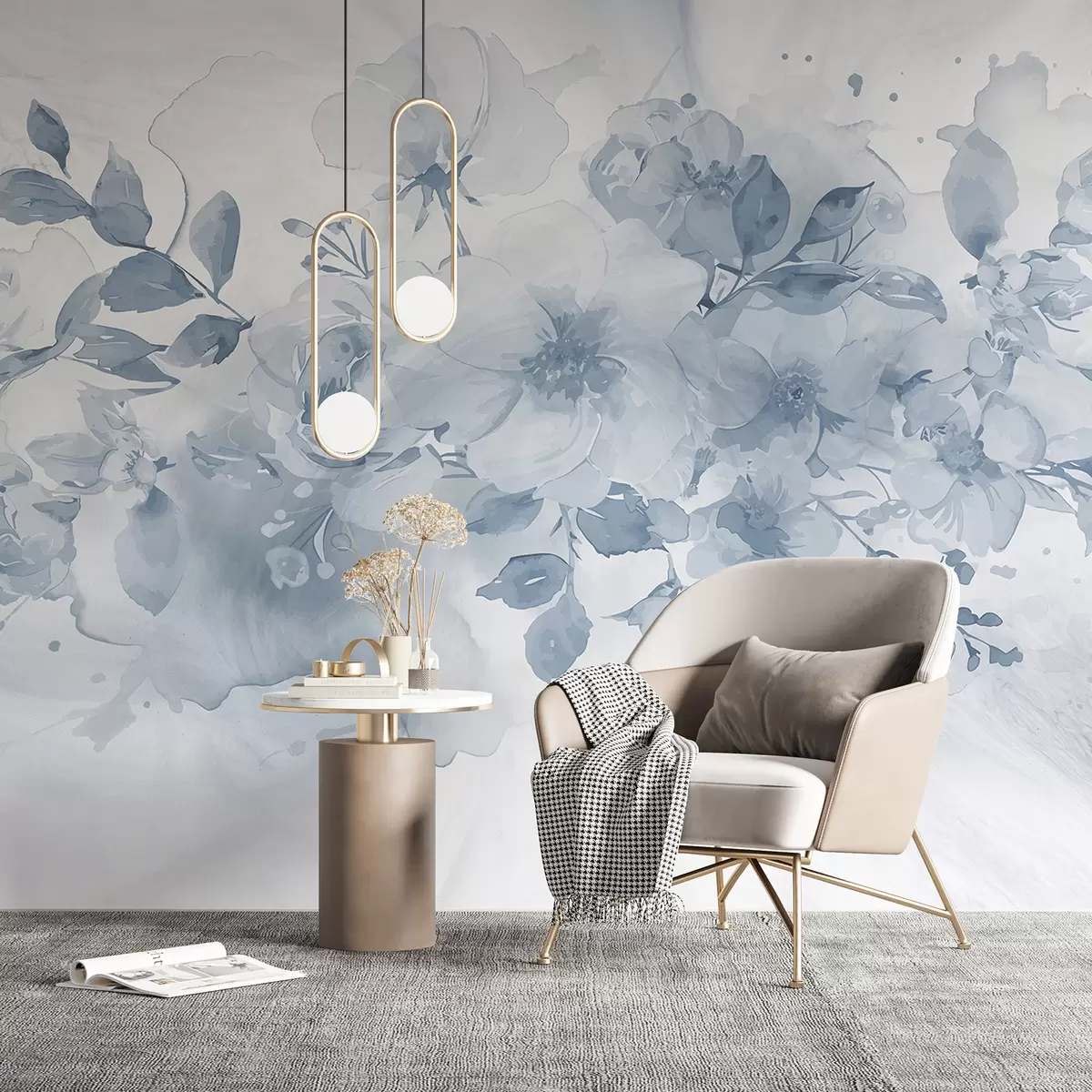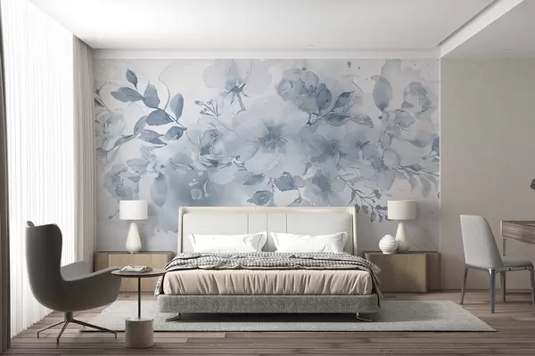 Valokuvatapetti Pehmeä, epäselvä kukkakuvio harmaan ja valkoisen sävyissä, herkillä kukilla ja lehdillä Nr w08189