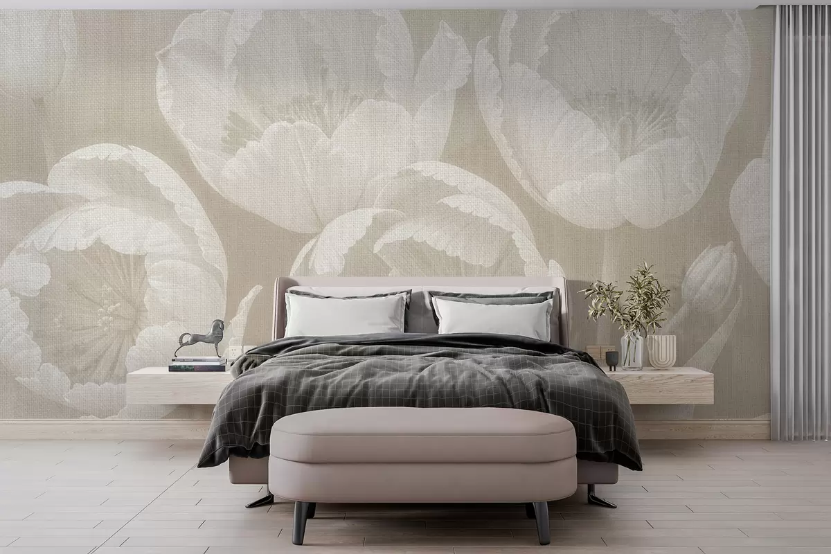 Valokuvatapetti Piirustus valkoisista tulppaaneista pehmeällä, kangaskuvioidulla vaaleanpunaisella sumealla taustalla minimalistisella yksivärisellä painatuksella Nr w08193v1