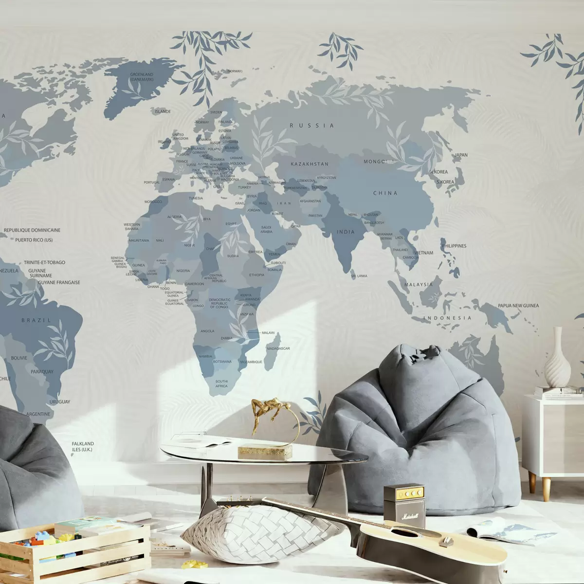Valokuvatapetti Tyylikäs maailmankartta, jossa on sinisiä lehtiä ja kasveja Nr w08211v4