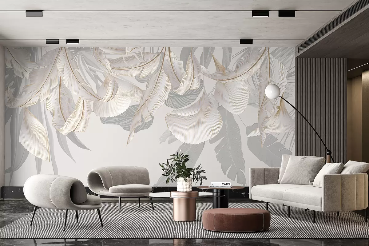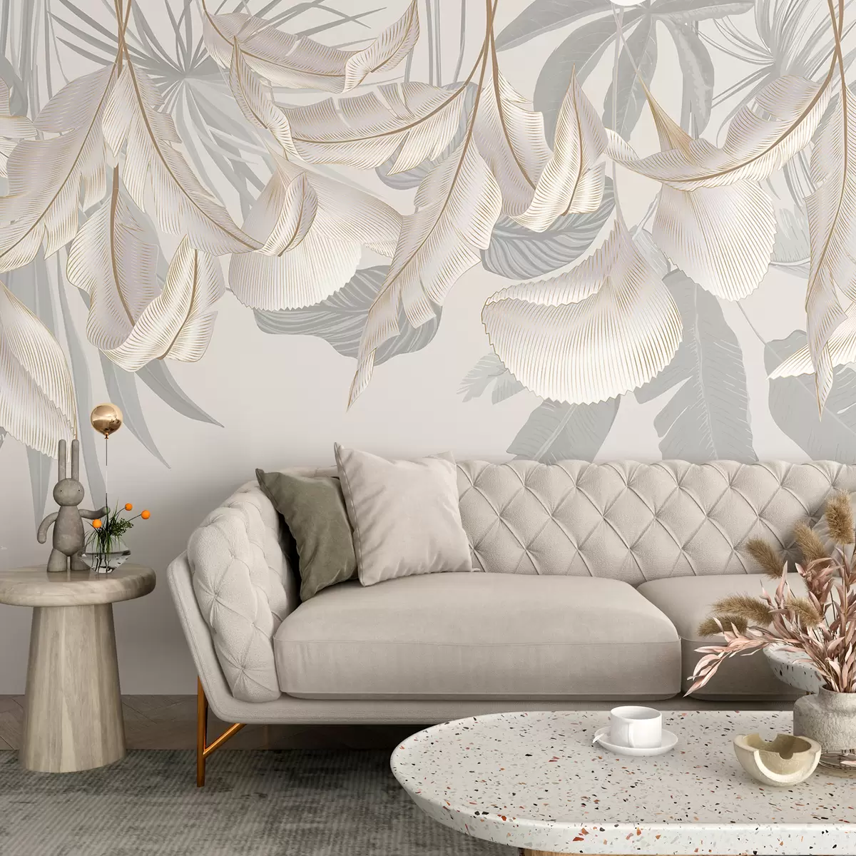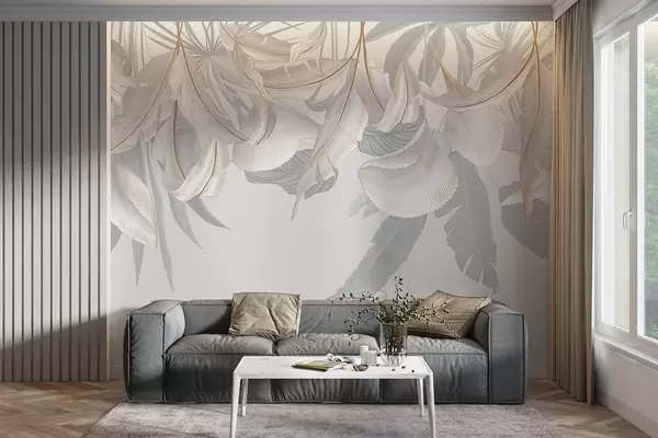 Valokuvatapetti Herkät valkoiset ja harmaat kukkaiset trooppiset lehdet luovat pehmeän, eteerisen taustan Nr w08217