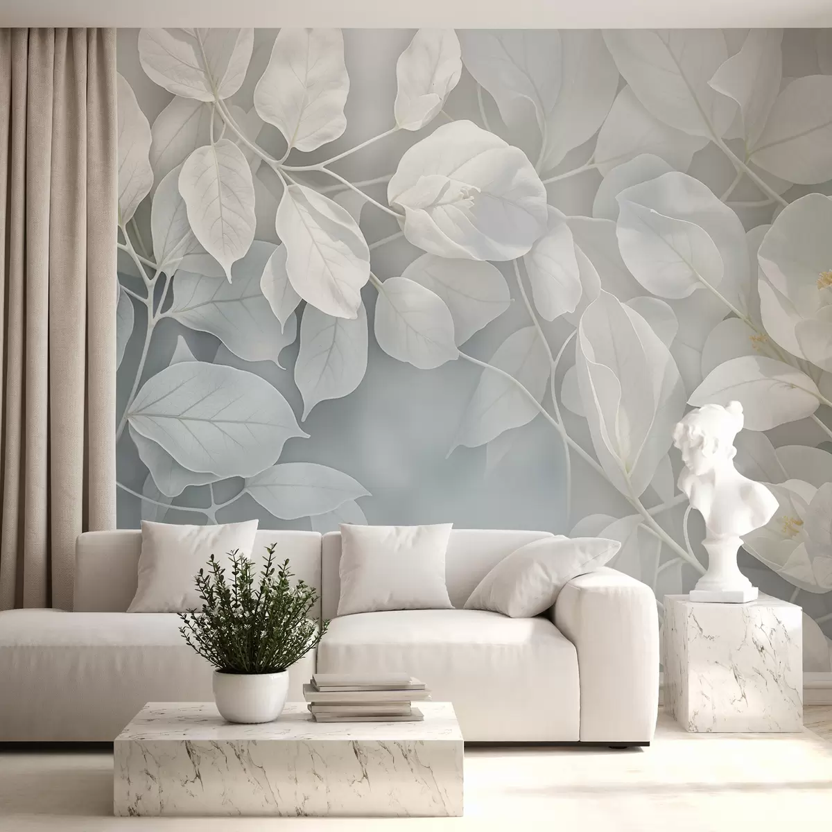 Valokuvatapetti Pehmeät, herkät valkoiset kukat harmaanvihreillä lehdillä sumennetulla taustalla luoden rauhallisen tunnelman Nr w08232