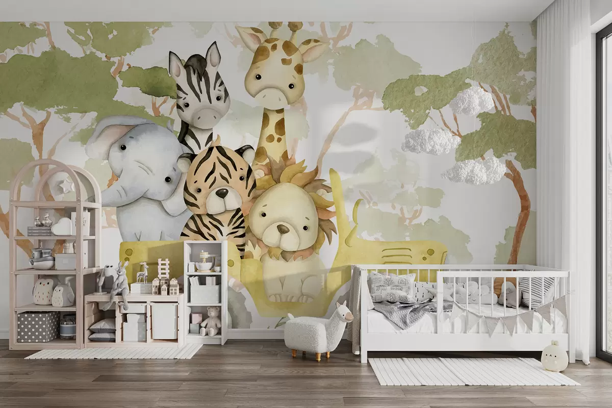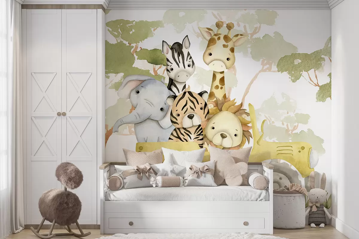 Valokuvatapetti Keltainen leluauto kuljettaa kirahvia, tiikeria, kania ja norsua vihreän lehvistön taustalla Nr w08233