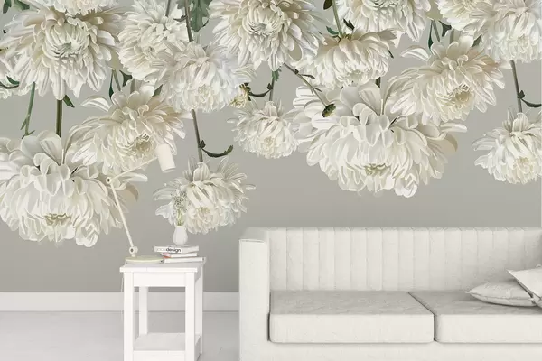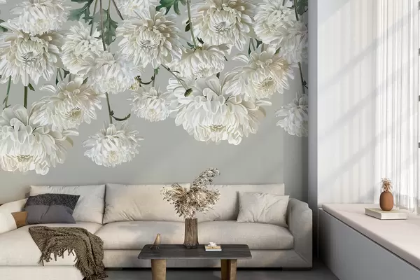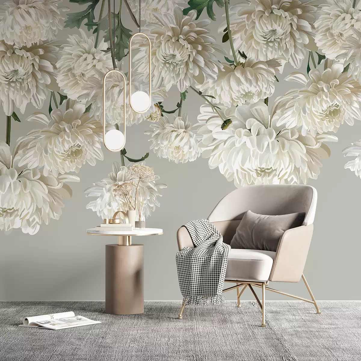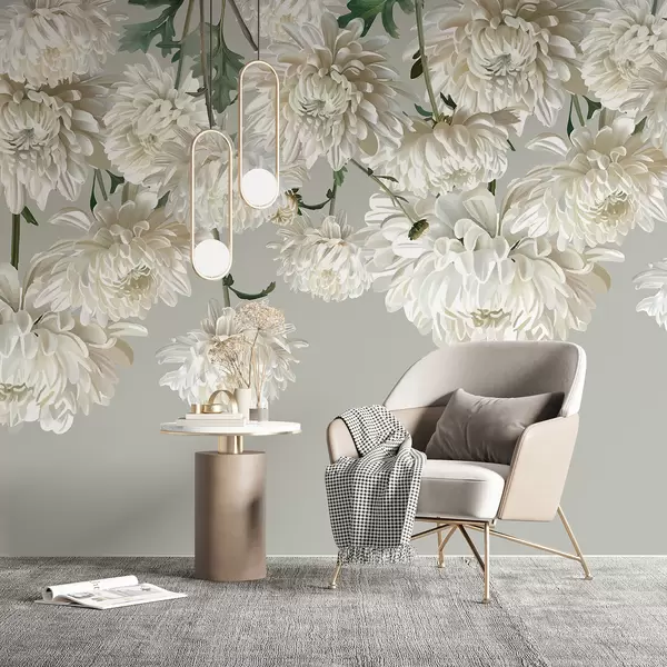 Valokuvatapetti Valkoiset krysanteemin kukat ja vihreät lehdet vaaleanharmaalla pohjalla Nr w08251