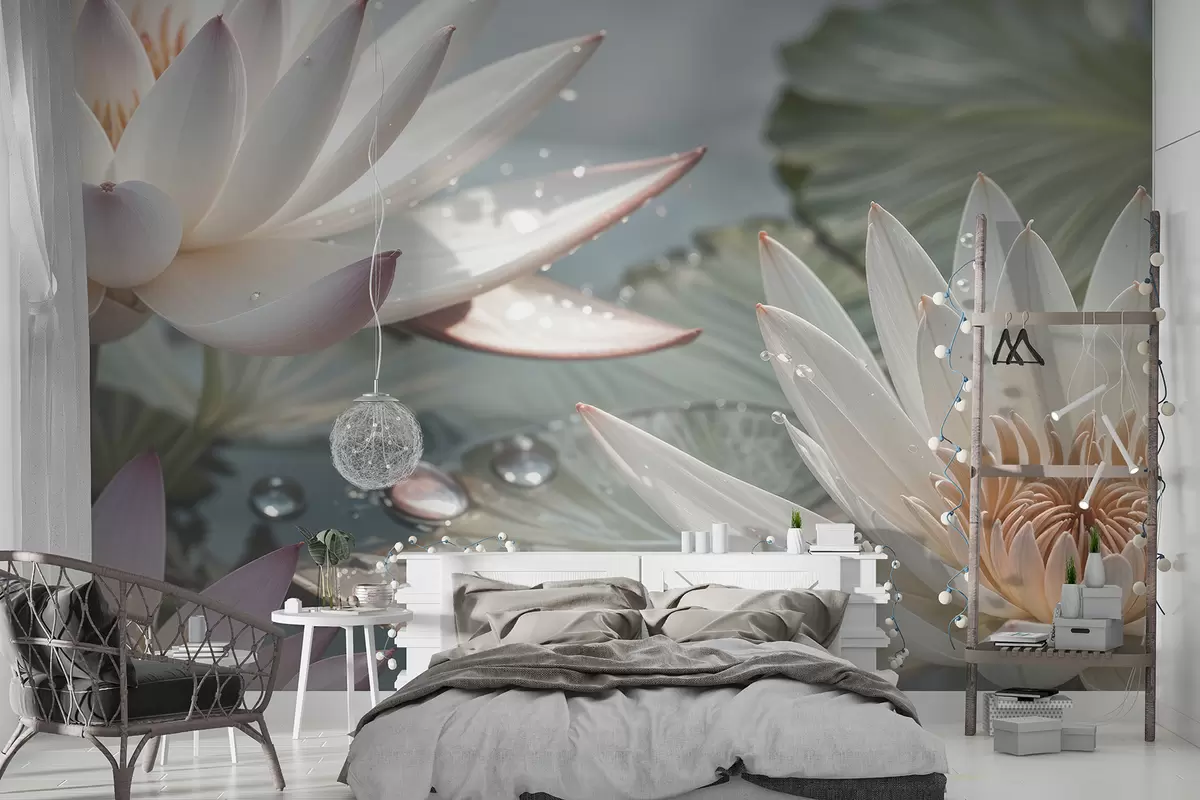 Valokuvatapetti Lähikuva valkoisista lootuskukista, joiden terälehdillä on vesipisaroita, sumeaa vihreää taustaa vasten Nr w08252