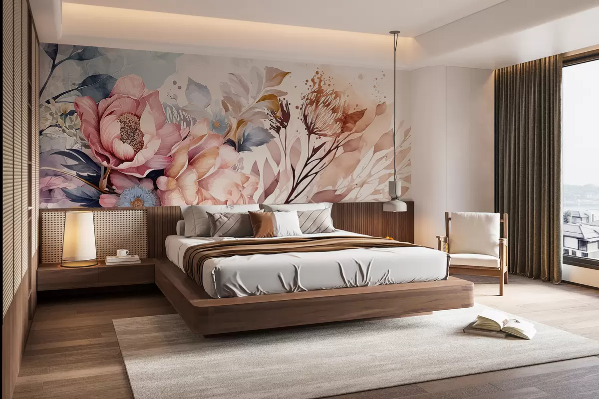 Valokuvatapetti Suuret vaaleanpunaiset ja siniset kukat, joissa on herkät terälehdet, joita ympäröivät pienemmät kukat akvarelliväritaustaa vasten Nr w08256