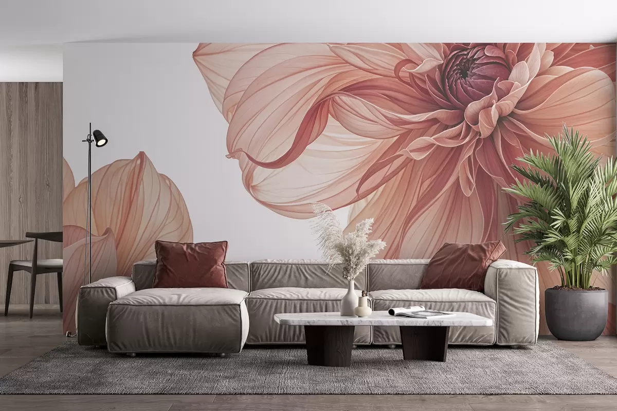 Valokuvatapetti Lähikuvassa useita suuria, elinvoimaisia punaisia daaliakukkia, joissa on pehmeät, herkät terälehdet valkoista taustaa vasten Nr w08257