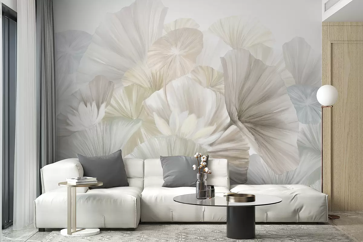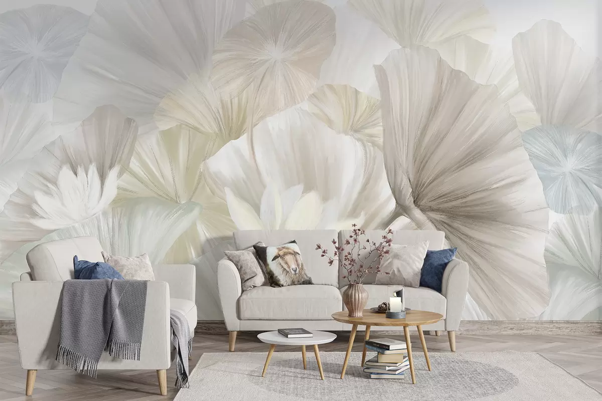 Valokuvatapetti Herkkä vihreä lootuksen lehdet valkoisia kukkia pehmeä, höyhenpehmeä terälehdet järjestetty luonnon taiteen koostumus Nr w08265