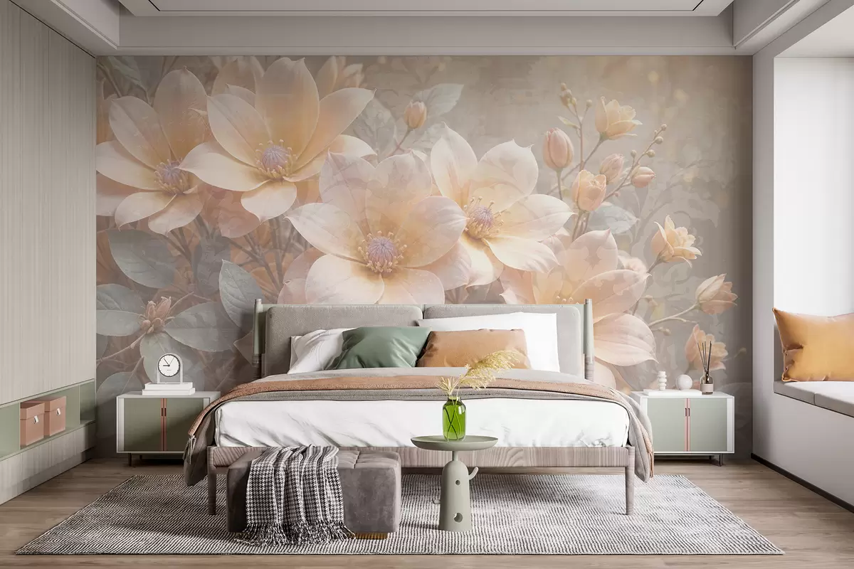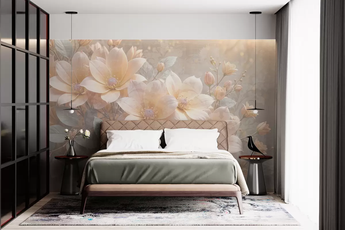 Valokuvatapetti Pastellivärisiä kukkia, joissa on hennot terälehdet sumeaa kuvioitua taustaa vasten, luoden seesteisen tunnelman Nr w08273