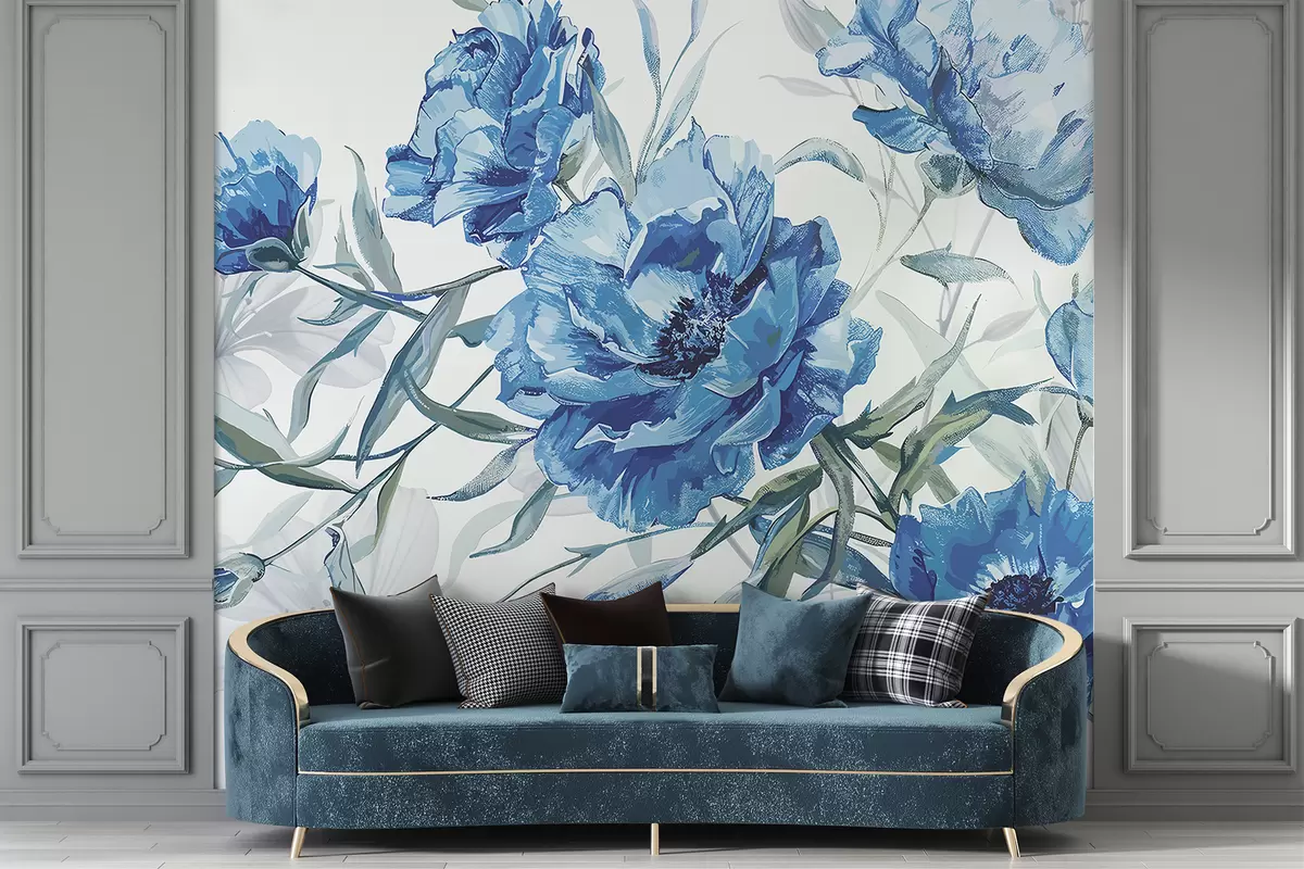Valokuvatapetti Sininen pionit maalaus rehevä lehdet vastaan kevyt abstrakti tausta  w08274v1