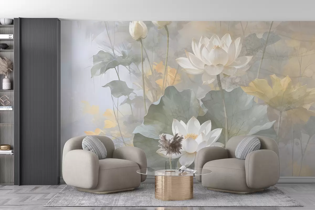 Valokuvatapetti Valkoiset lootuksen kukat ja lehdet lammessa, jossa on pehmeä, sumea keltainen ja vihreä tausta Nr w08275