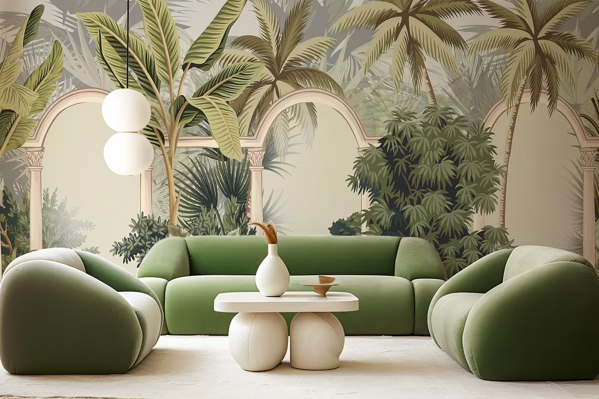 Valokuvatapetti Kaaret, joissa on trooppinen maisema, reheviä palmuja ja muita lehtiä vaaleaa taustaa vasten Nr w08306