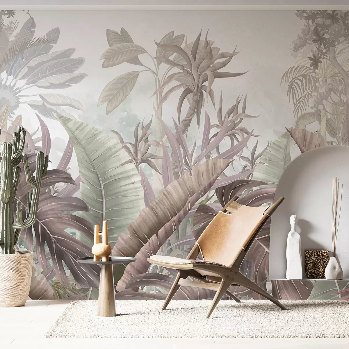Valokuvatapetti Trooppinen viidakko, jossa on suuria palmunlehtiä ja eksoottisia kasveja harmaan, valkoisen ja beigen sävyissä Nr w08307