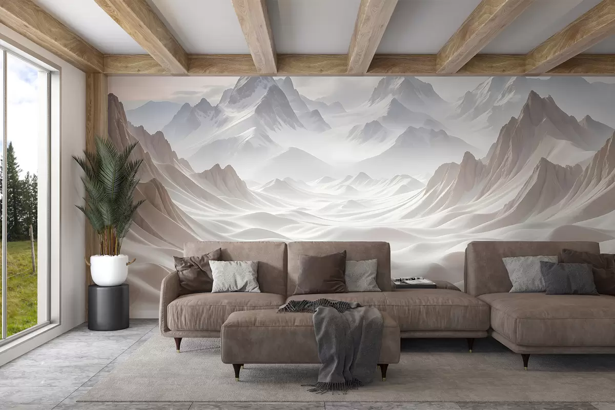 Valokuvatapetti Lumiset vuorenhuiput nousevat sumuisesta, eteerisestä maisemasta, jossa on kumpuilevia kukkuloita ja laaksoja Nr w08313