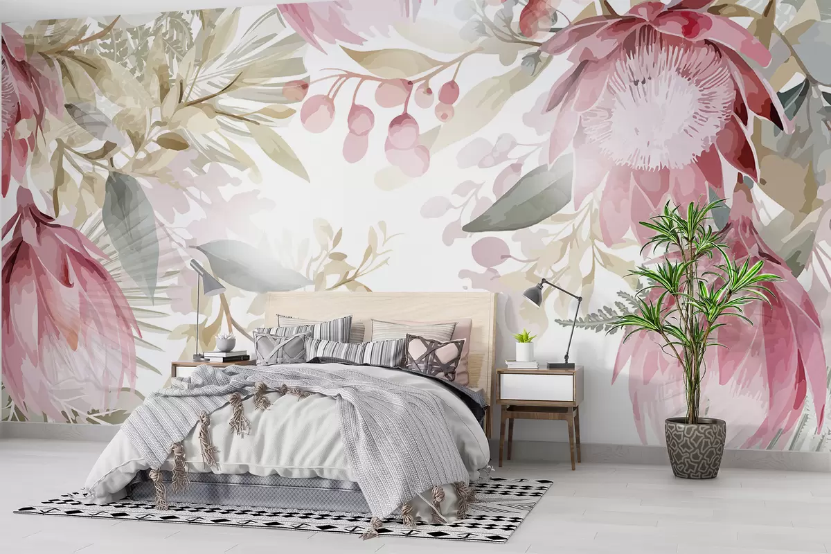 Valokuvatapetti Suuret vaaleanpunaiset ja valkoiset läpinäkyvät proteat, joissa on rehevät vihreät lehdet vaaleaa taustaa vasten w08315
