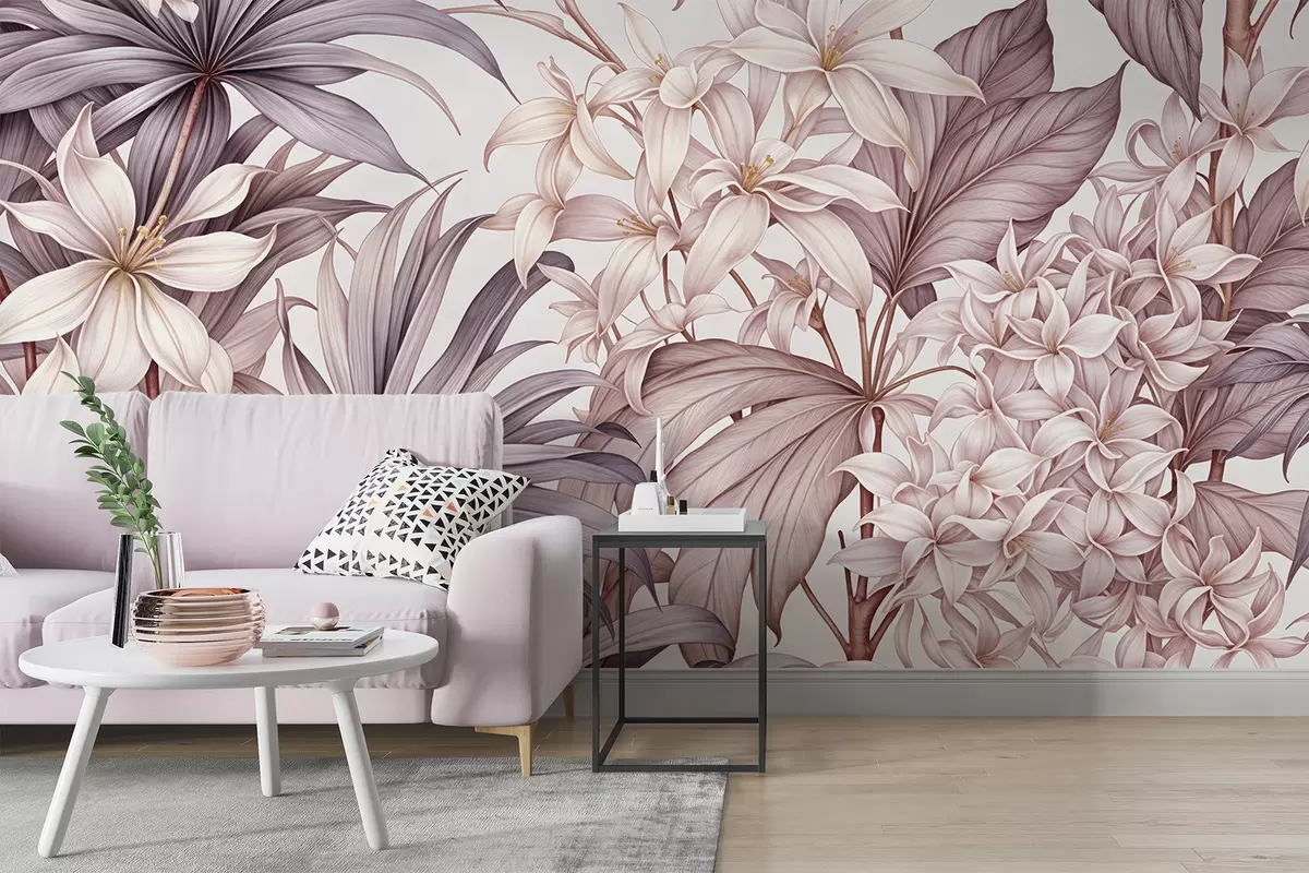 Valokuvatapetti Trooppinen kukkaprintti, jossa on suuria valkoisia ja vaaleanpunaisia kukkia, bordo lehtiä ja neutraali tausta Nr w08318v1