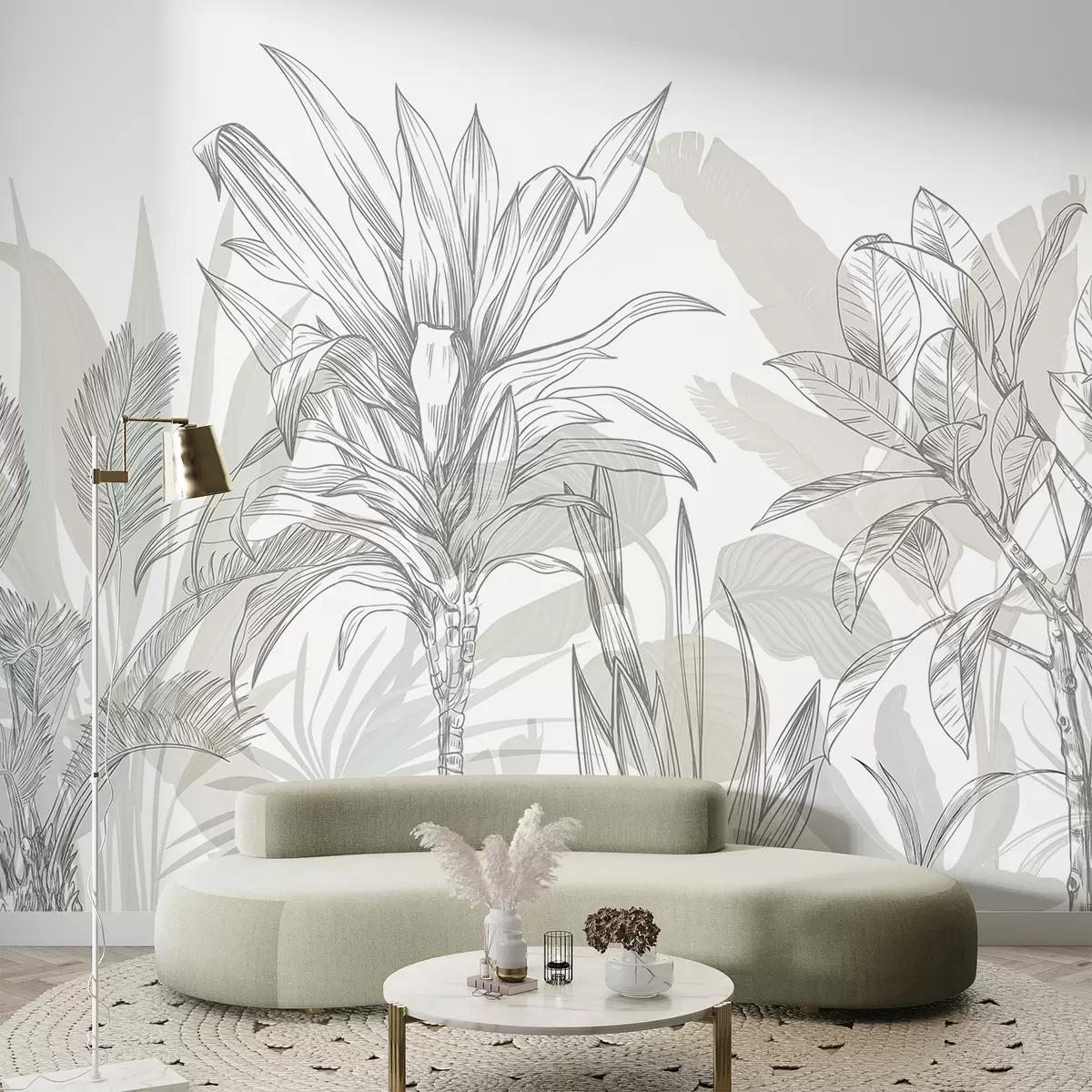 Valokuvatapetti Trooppinen graafinen kasvit, joissa on suuria, reheviä lehtiä ja kukkia harmaan ja valkoisen sävyissä, joissa on kukkien vihreät siluetit Nr w08327