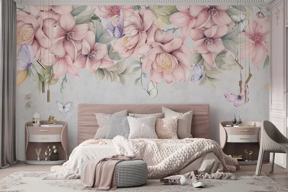 Valokuvatapetti Pehmeä vaaleanpunainen ja valkoinen florals herkkiä kukkia ja lehtiä kuvioitu harmaa tausta Nr w08331