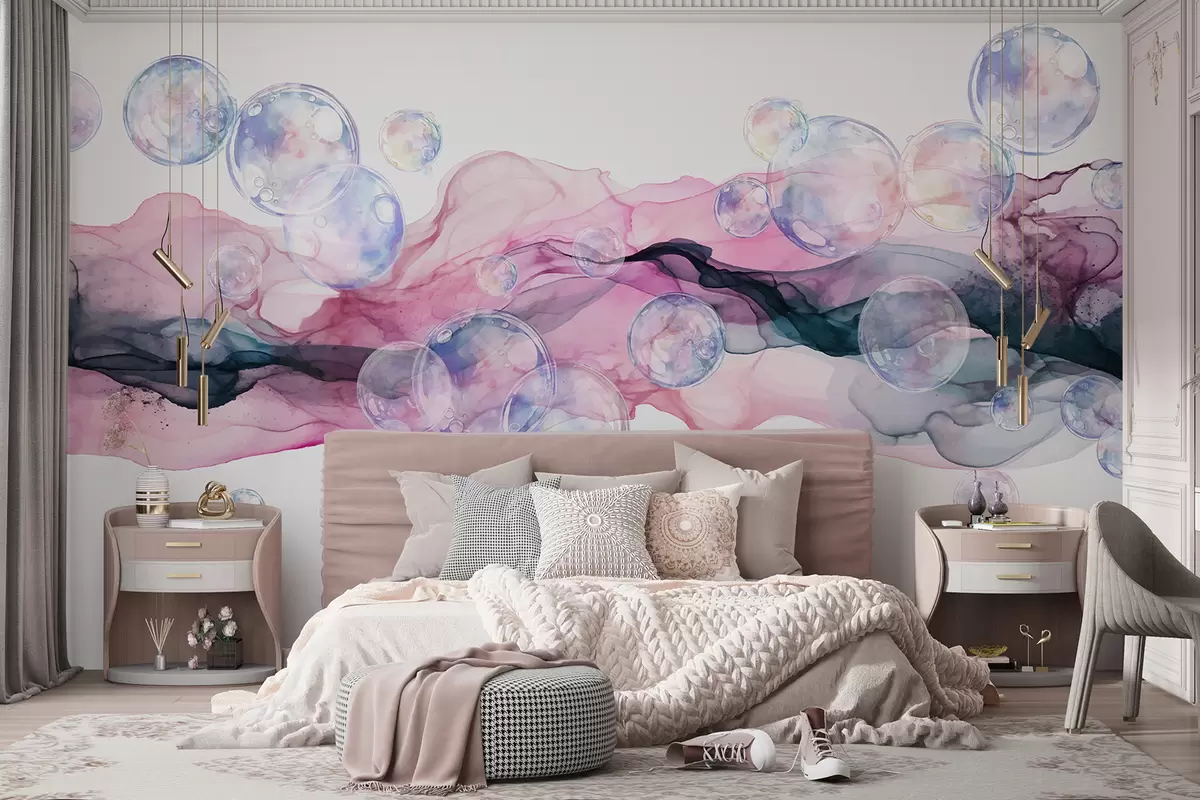 Valokuvatapetti Värikkäitä abstrakteja nestemäisiä muotoja, joissa on kuplia, vaaleanpunaisia, sinisiä ja violetteja värisävyjä valkoista taustaa vasten Nr w08337
