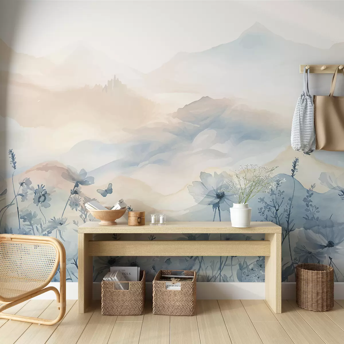 Valokuvatapetti Seesteinen maisema, jonka taustalla on sumuinen vuorijono, jota ympäröi herkkien sinisten kukkien kenttä Nr w08339