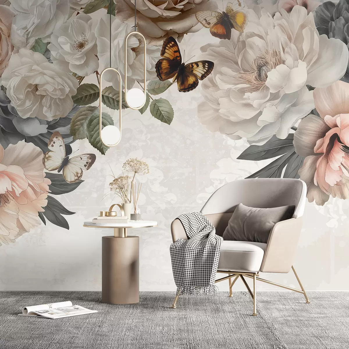 Valokuvatapetti Suuret valkoiset ja vaaleanpunaiset pionikukat, joissa perhonen istuu yhdellä kukista pehmeällä, sumealla taustalla Nr w08340