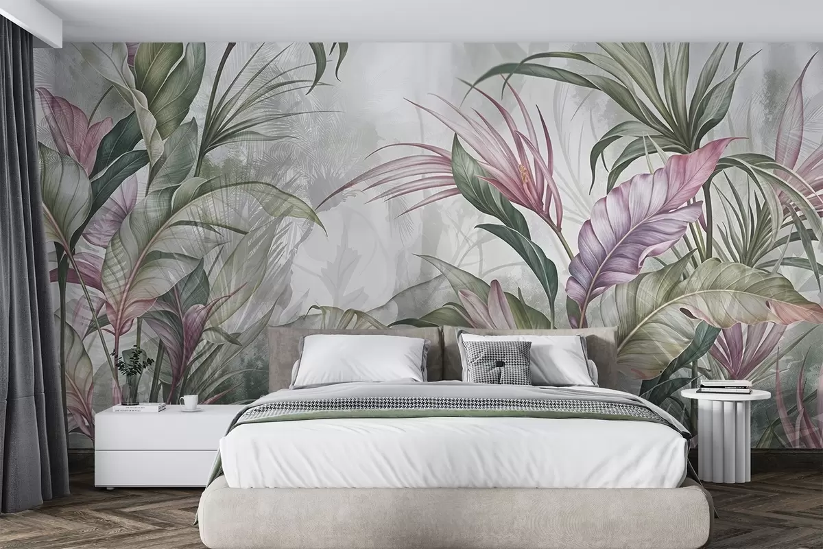 Valokuvatapetti Trooppinen viidakko, jossa on suuret vihreät lehdet ja vaaleanpunaiset protea-kukat, joissa on sumea kuvioitu tausta Nr w08375