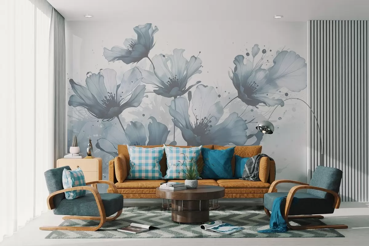 Valokuvatapetti Herkät siniset kukat, joiden terälehdet ovat pehmeät ja sumeat ja joissa on vesiväriroiskeita vaaleaa taustaa vasten Nr w08376