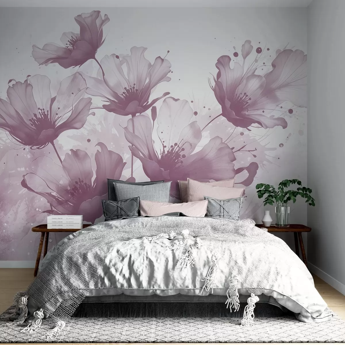 Valokuvatapetti Herkät vaaleanpunaiset kukat, joiden terälehdet ovat pehmeät, sumeat ja vesiväritahroja vaaleaa taustaa vasten Nr w08376v2