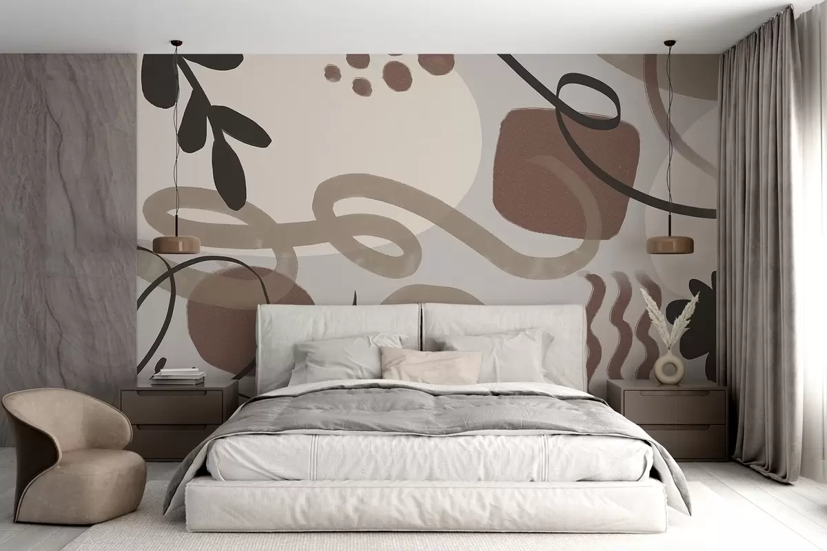Valokuvatapetti Abstrakti kuvioitu minimalistinen moderni tuloste, jossa on muotoja ruskean, beigen ja mustan maanläheisissä sävyissä Nr w08384