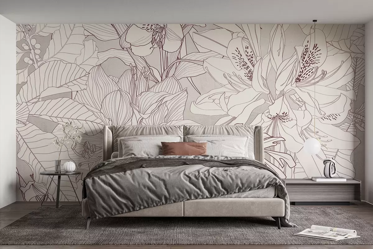 Valokuvatapetti Yksityiskohtainen bordo ja harmaa kukkapainatus, jossa on erilaisia kukkia ja lehtiä, rehevä, monimutkainen kasvitieteellinen muotoilu Nr w08385