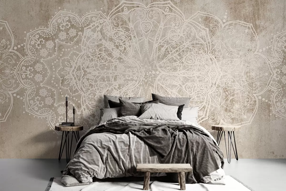 Valokuvatapetti Yksityiskohtainen, monimutkainen valkoinen pitsinen mandalakuvio kuvio kuvioidulla parvella beige-ruskealla seinätaustalla Nr w08387v1