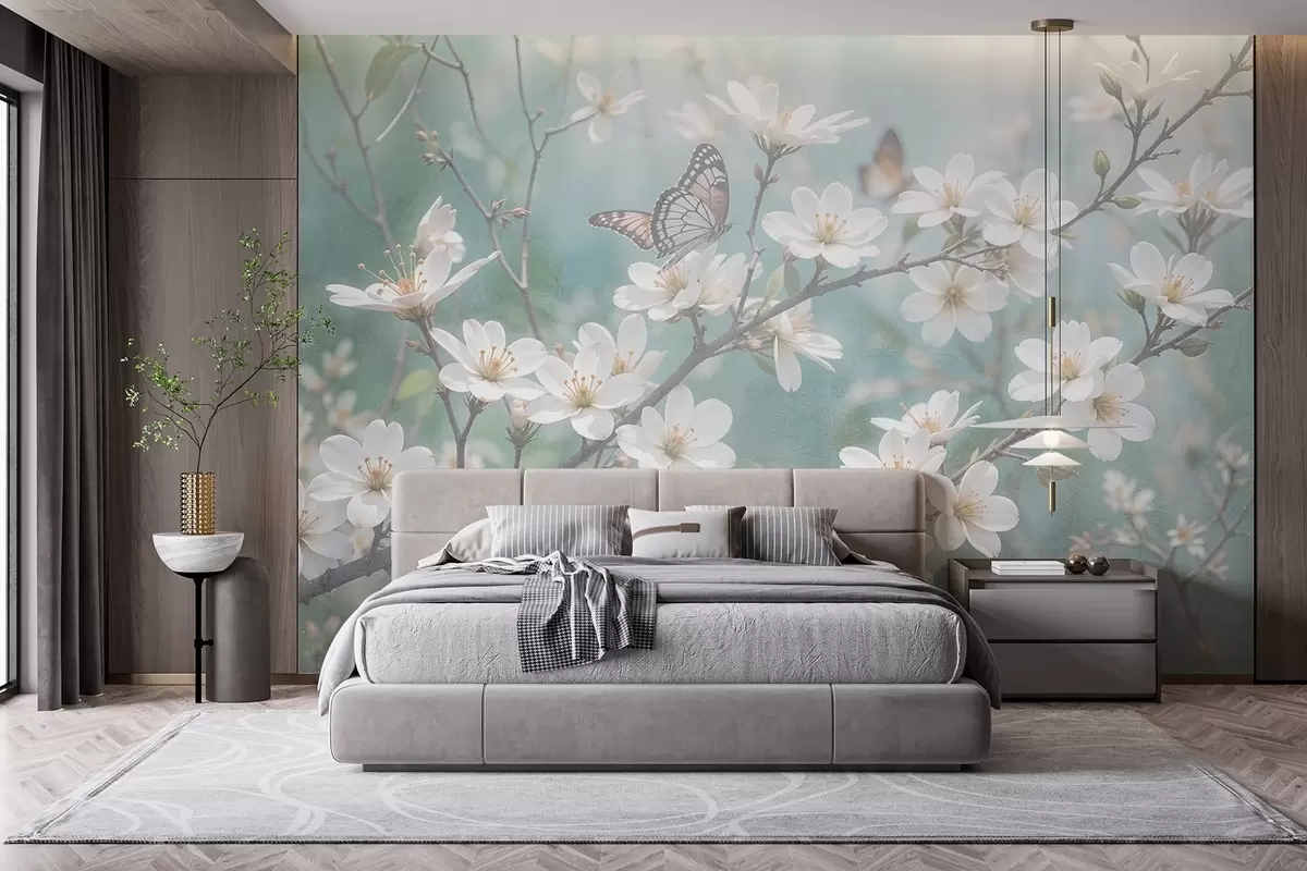 Valokuvatapetti Valkoinen perhonen oksalla, jonka etualalla on hentoja valkoisia kirsikankukkia sumeaa taustaa vasten Nr w08421