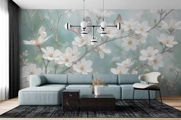 Valokuvatapetti Valkoinen perhonen oksalla, jonka etualalla on hentoja valkoisia kirsikankukkia sumeaa taustaa vasten w08421