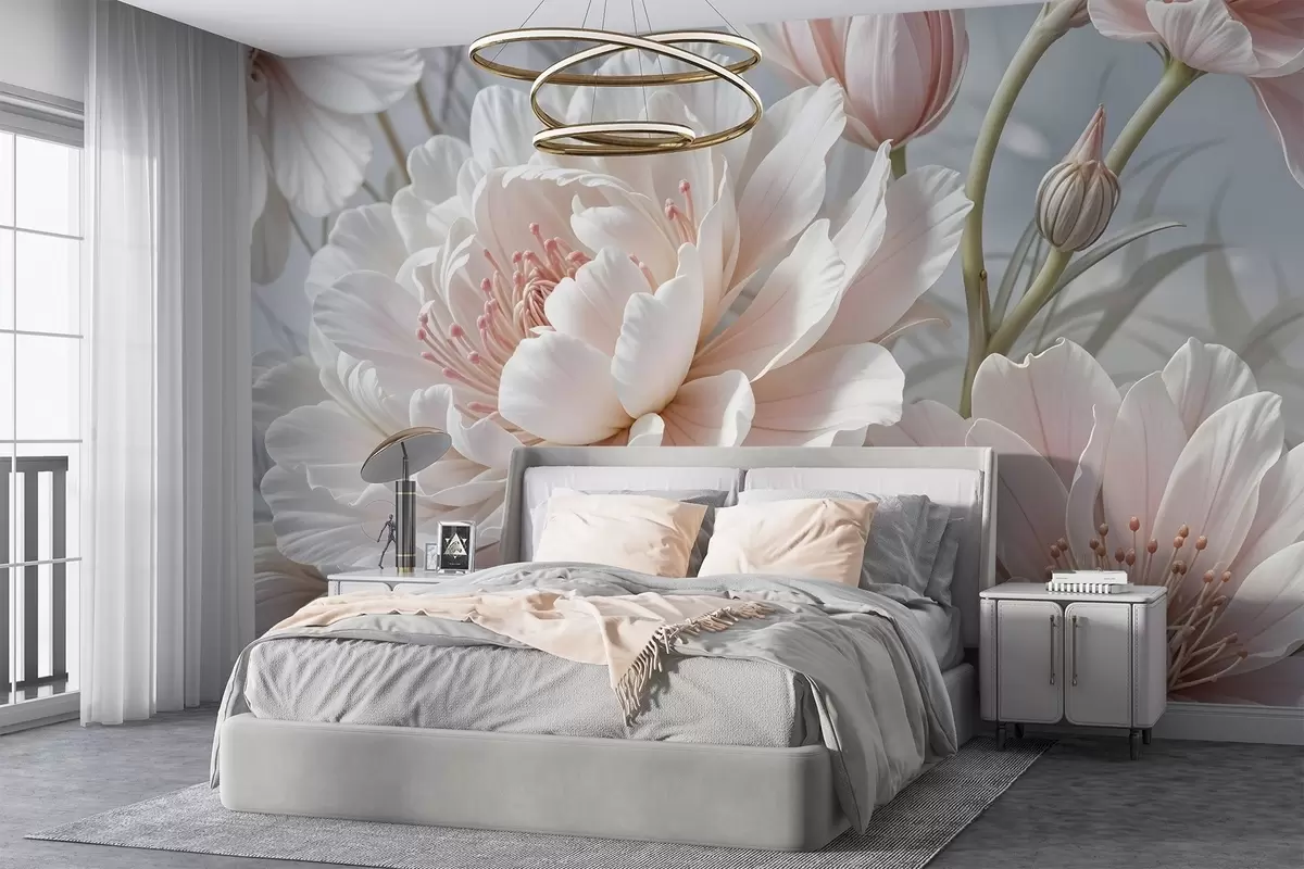 Valokuvatapetti Suuret, herkät valkoiset ja vaaleanpunaiset pionikukat, joissa on pehmeät, pörröiset terälehdet sumeaa harmaata taustaa vasten w08427