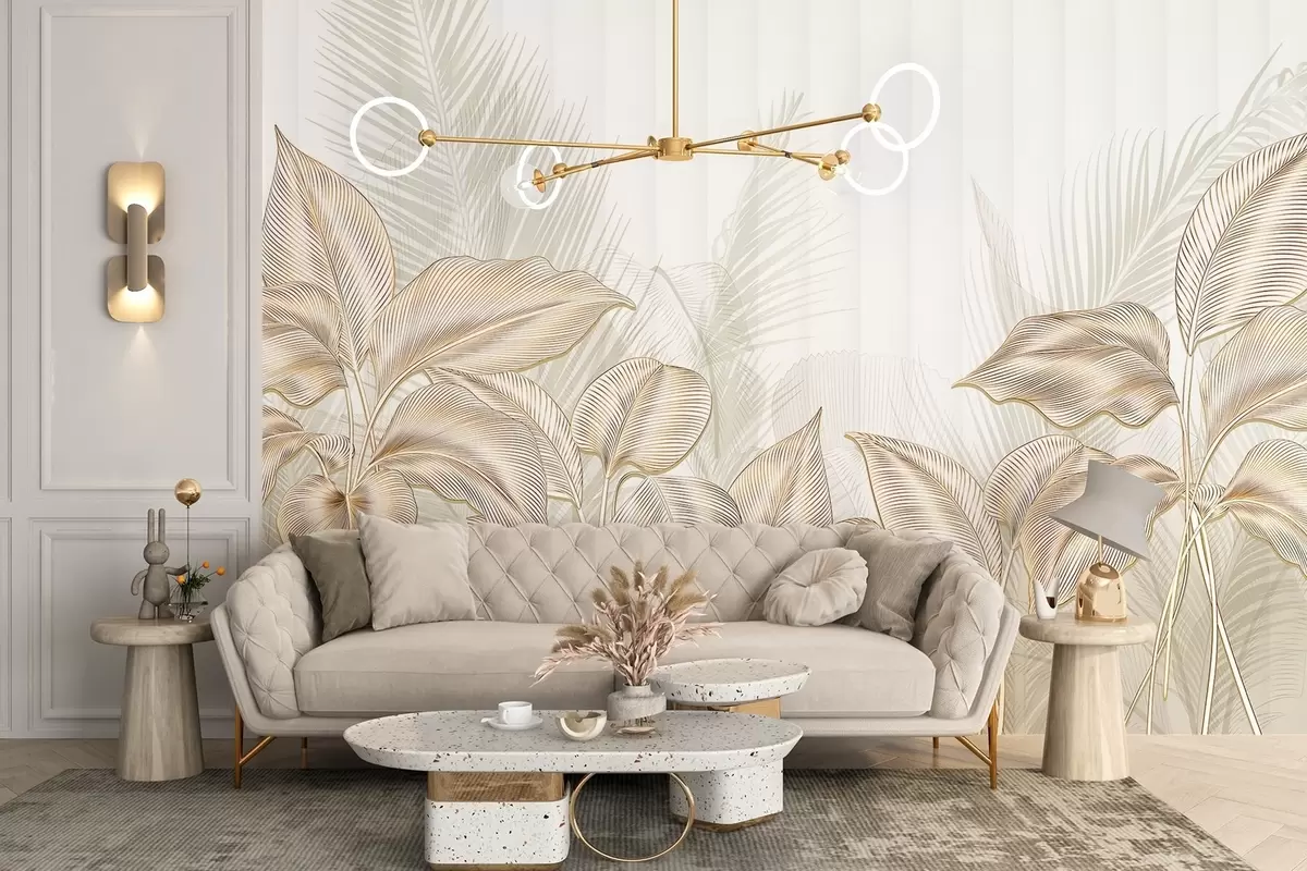 Valokuvatapetti Tyylikkäät valkoiset ja beiget palmunlehdet vaaleaa, kuvioitua taustaa vasten Nr w08434