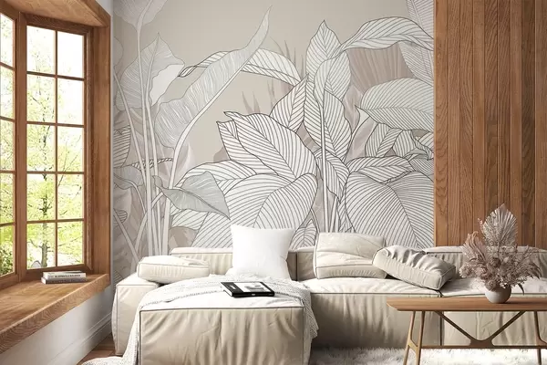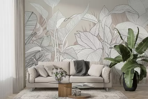 Valokuvatapetti Yksivärinen kuvitus, jossa on suuria, tyyliteltyjä lehtiä ja lehtiä, joissa on monimutkaisia viivakuvioita ja kuvioita Nr w08436v1