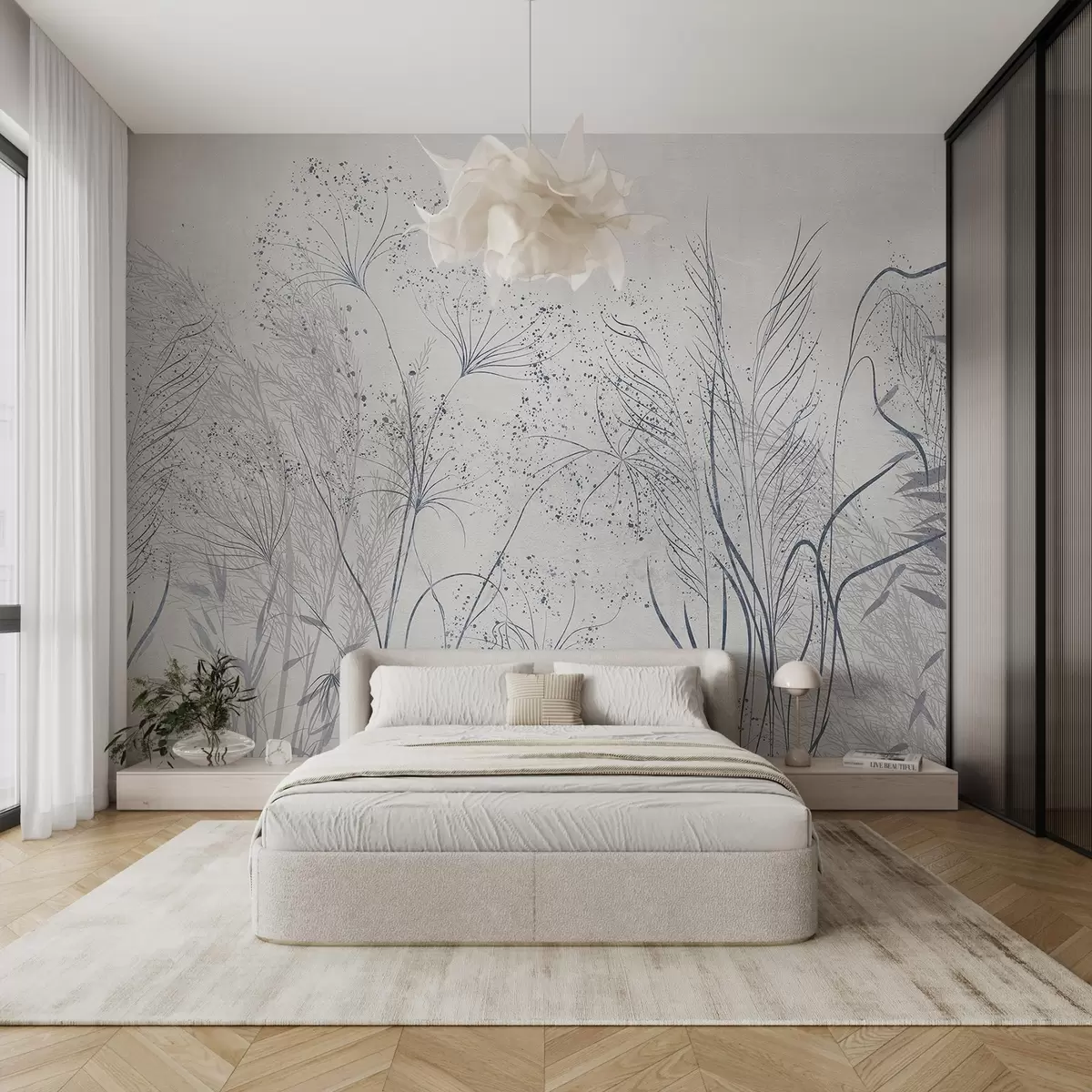 Valokuvatapetti Yksivärinen kuvitus erilaisista harmaista kasveista ja tähkistä, joissa on herkkiä, hentoja viivoja ja kuvioita Nr w08441v1