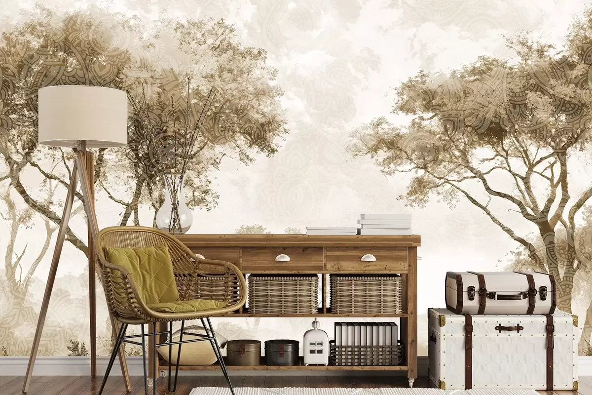 Valokuvatapetti Sumuinen, seesteinen maisema, jossa etualalla on siluettipuut ja pehmeä sumu ruskean ja beigen sävyissä Nr w08442v2