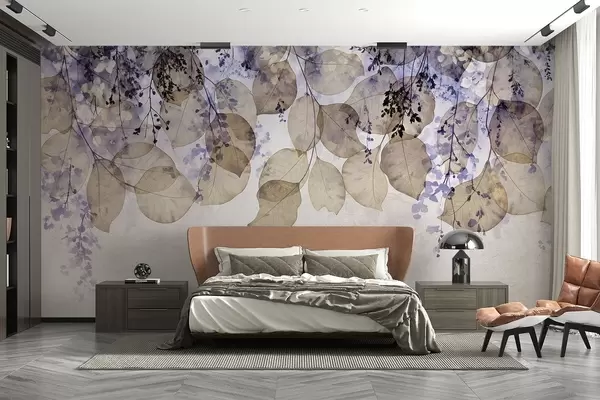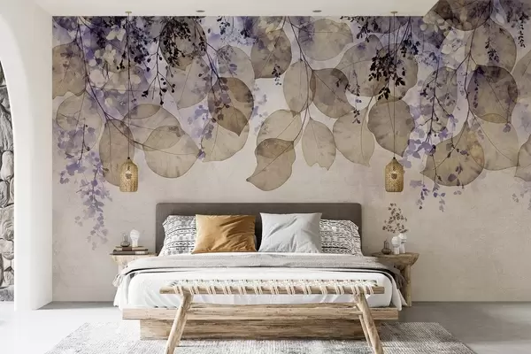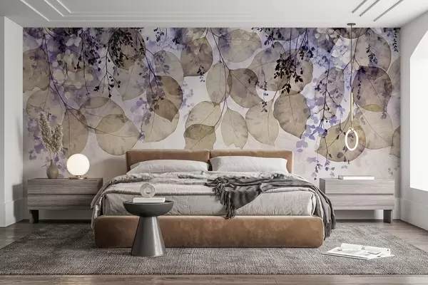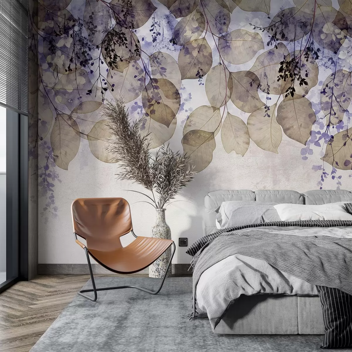 Valokuvatapetti Hienovaraisia kuivattuja lehtiä ja kukkia violetin, beigen ja valkoisen sävyissä vaaleaa taustaa vasten Nr w08447