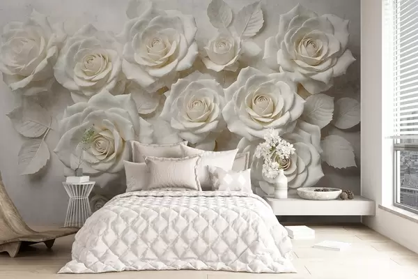 Valokuvatapetti Lähikuvassa useita valkoisia ruusuja, joissa on pehmeät, herkät terälehdet valkoisella pohjalla Nr w08448