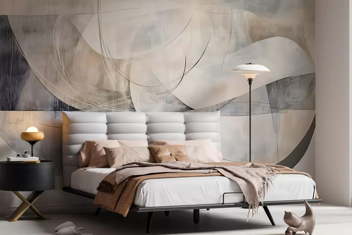 Valokuvatapetti Abstrakteja muotoja ja muotoja valkoisen, harmaan, beigen ja sinisen sävyissä sumeaa kuvioitua taustaa vasten Nr w08461