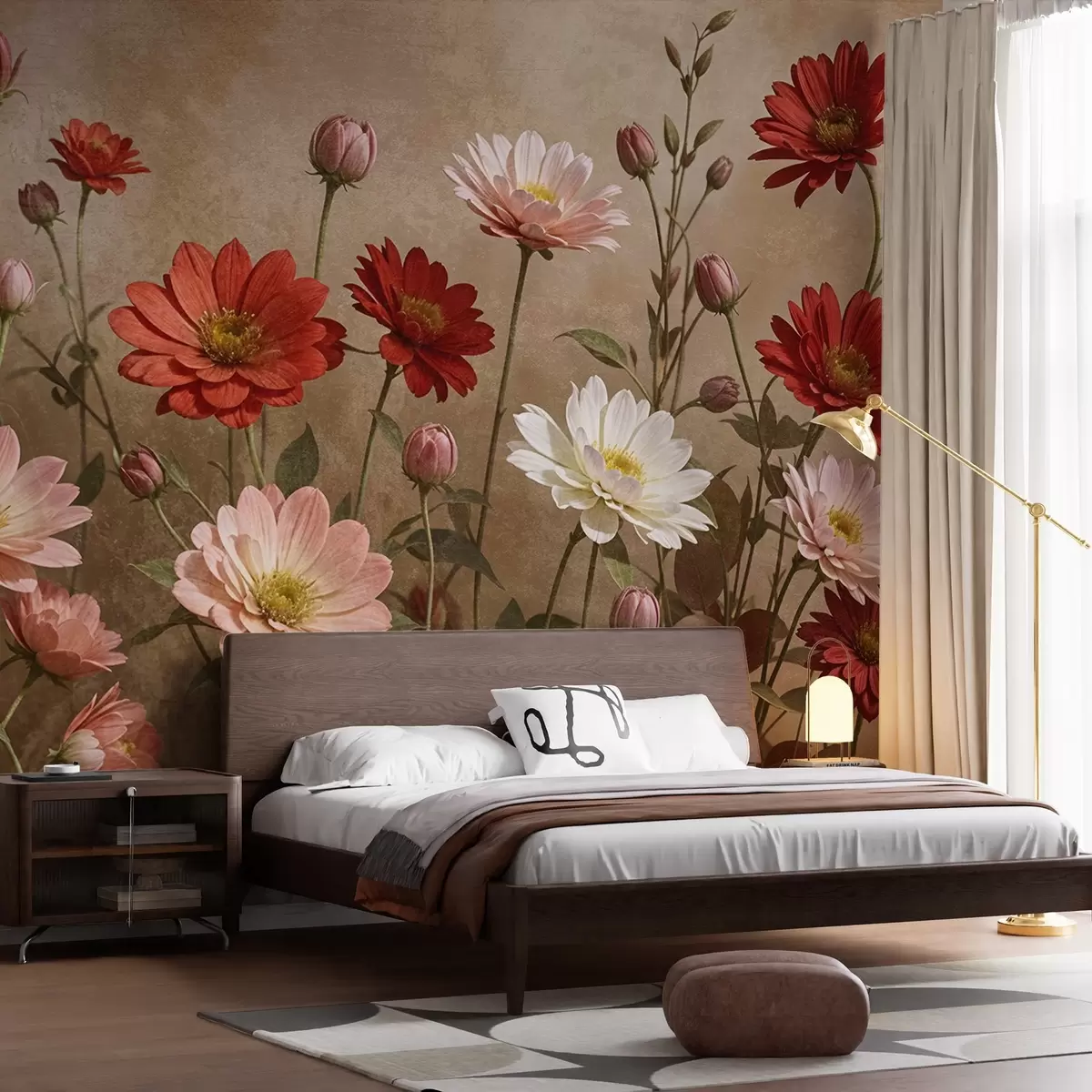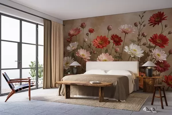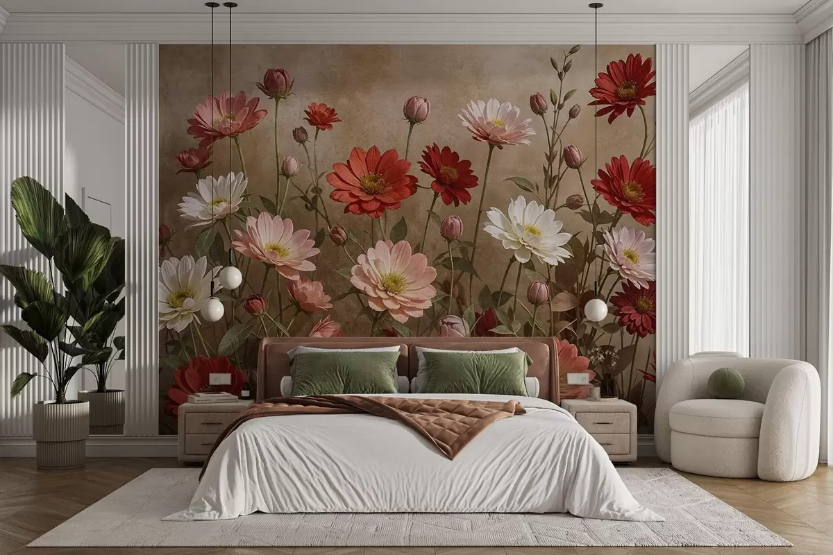 Valokuvatapetti Kenttä värikkäitä päivänkakkaran kaltaisia kukkia eri sävyjä vaaleanpunainen , punainen ja valkoinen vastaan kuvioitu tausta Nr w08462
